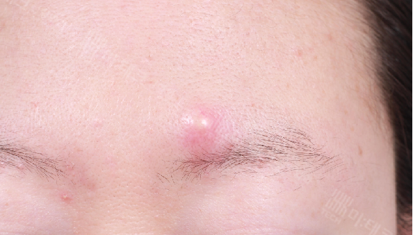 좌측 눈썹 위쪽에 염증반응이 생긴 표피낭종을 주소로 저희 병원에 수술을 위해 내원하신 분입니다.