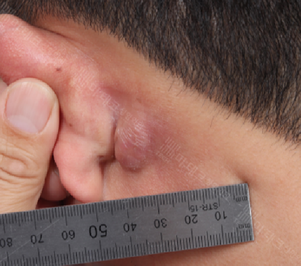 2.6cm가량의 종기가 귀 뒤편에 광범위하게 자리 잡고 있습니다.