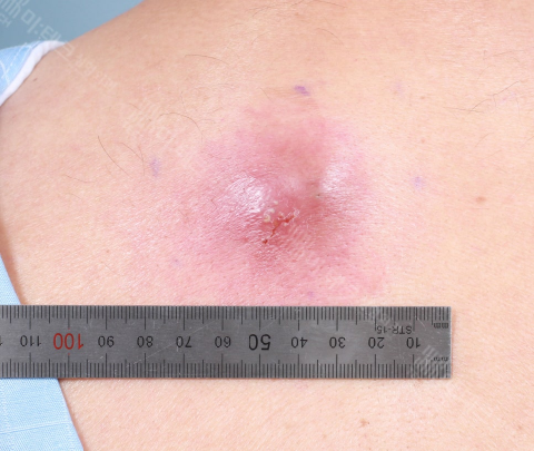 등 부위에 벌겋게 부어오른 덩어리가 있네요.