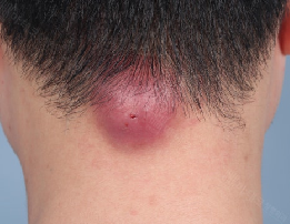 다행히도 종기 내 머리카락들이 자라면서 흉터를 덮어주어 크게 보이지 않는 상태입니다.