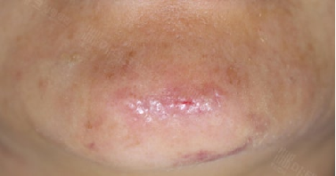 턱 한가운데 살점이 짓이겨진 상태입니다.
