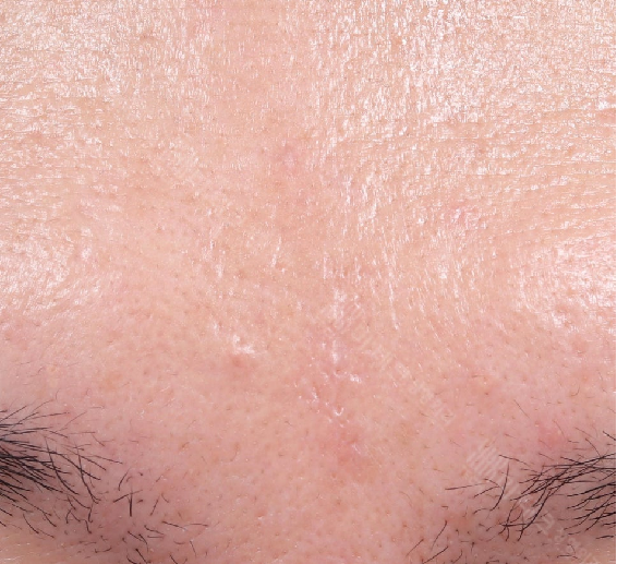 눈썹과 눈썹 사이, 미간 바로 위쪽에 세로로 약 2.2cm 가량의 상처가 보입니다.