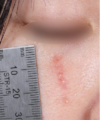 레이저 치료를 받고 있지만 아직 붉은 기운이 남아 있고, 간헐적으로 뾰루지같이 올라오기도 합니다.