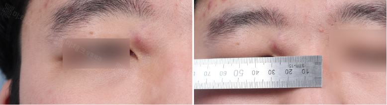 육안으로 보았을 때 약 지름 1.5cm 가량의 큰 덩어리가 코 바로 옆, 우측 눈과 눈썹 사이에서 관찰되었습니다.