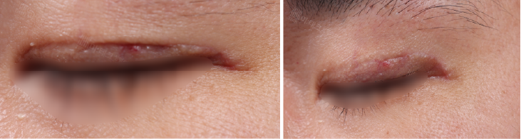 눈꺼풀 근처 피부가 소실되면서 안쪽 근육까지 함께 손상이 된 상태였는데요.