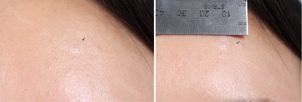 이마에 약 0.5cm 가량의 구멍이 있는 전형적인 모양의 덩어리가 만져집니다.