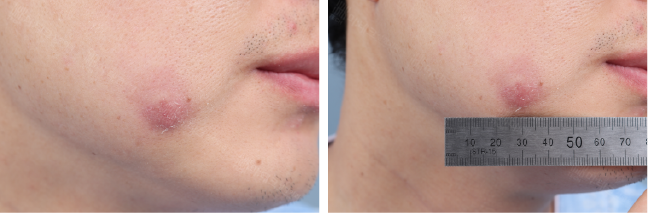 육안으로 보았을 때 약 지름 1.8cm 가량의 큰 덩어리가 우측 볼 부위에서 관찰되었습니다.