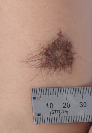약 2cm 가량의 팔꿈치 바로 아래쪽의 멜라닌 모반입니다.