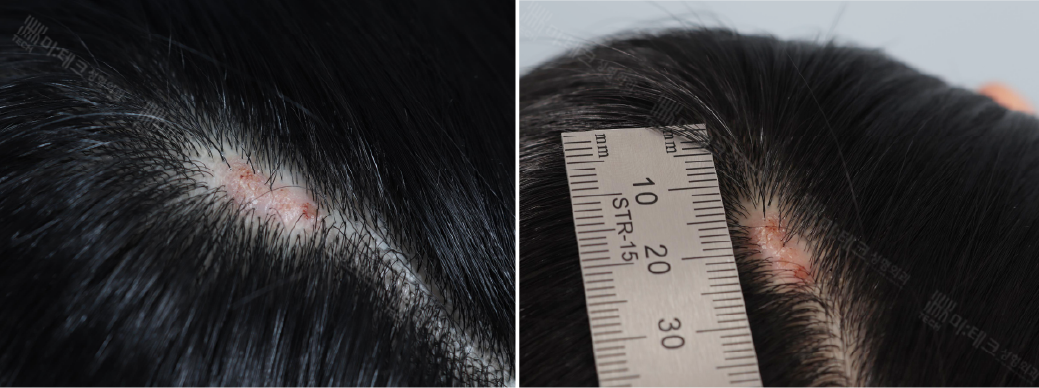 정수리 쪽에 약 1.7cm 정도의 긴 모양의 피지선 모반이 보입니다.