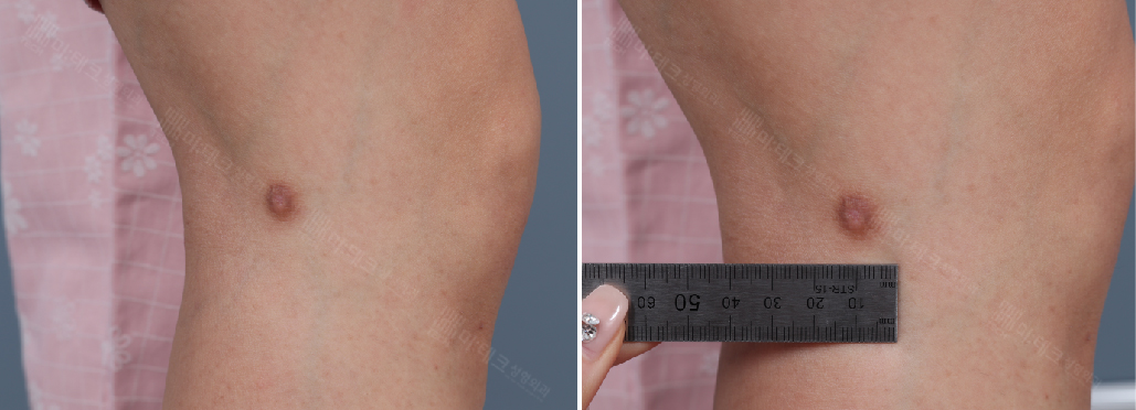 우측 무릎의 바깥쪽에 지름 약 1cm 정도의 적갈색 돌기를 볼 수 있습니다.