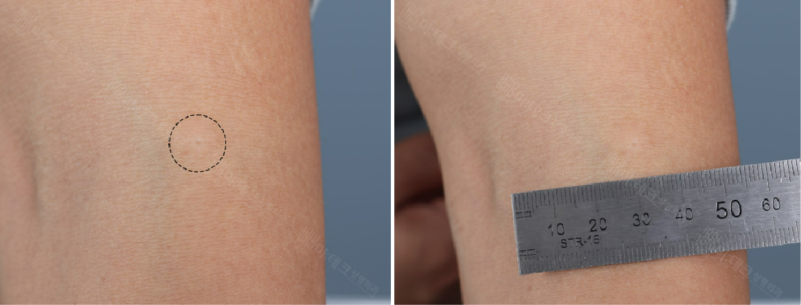 육안으로 보았을 때 약 지름 0.5cm 가량의 작은 덩어리가 좌측 팔꿈치의 바깥쪽 부위에 있었습니다.