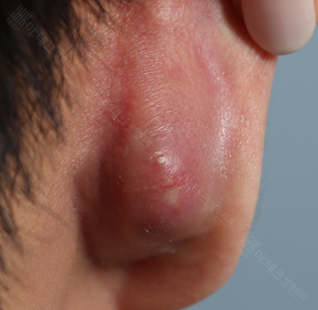 귀 뒤편 연골 면에 닿은 병변이 보입니다. 거의 고름집이 된 것으로 보입니다.