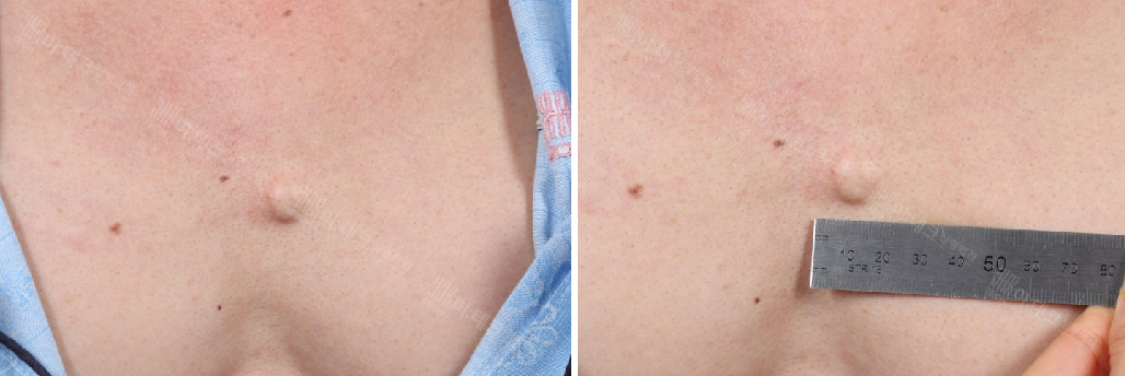 육안으로 보았을 때 약 지름 1.3cm 가량의 큰 덩어리가 가슴 바로 한가운데(복장뼈 위치)에 관찰되었습니다.